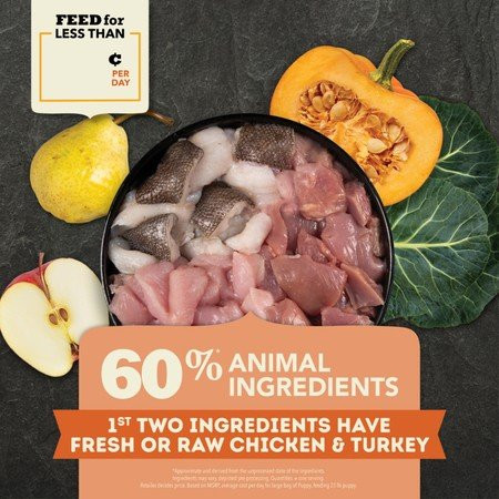Esta receta de comida para perros rica en proteínas comienza con pollo y pavo de libre pastoreo y huevos frescos, y está equilibrada para incluir hasta un 65% de ingredientes animales de alta calidad y 35% de frutas y vegetales nutritivos.